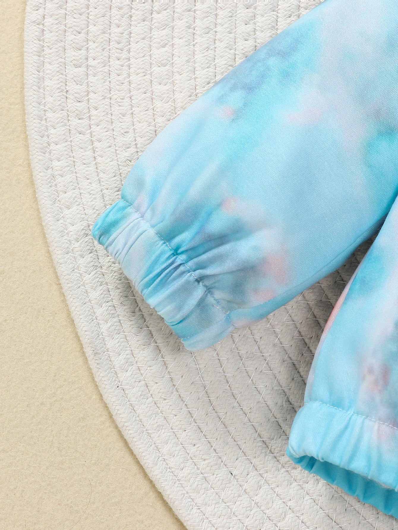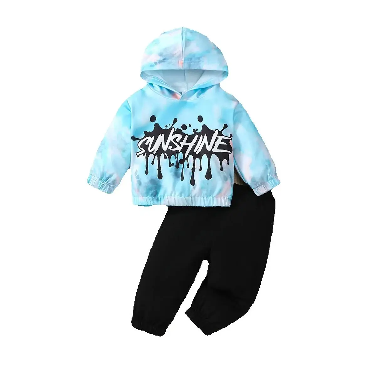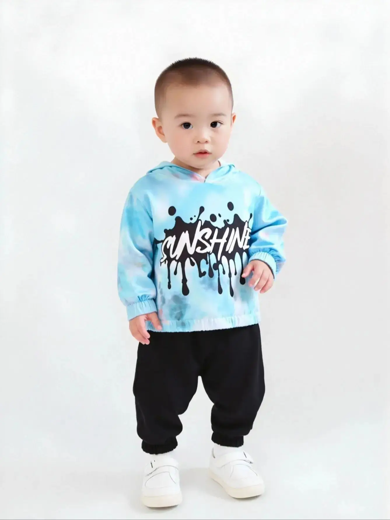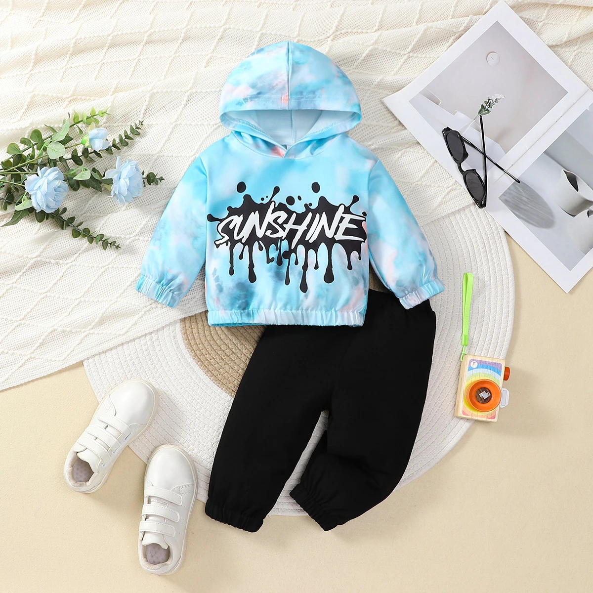 2-piece set of fashionable casual letter printed tie dye hooded long sleeved top and pants for baby boys, autumn and winter