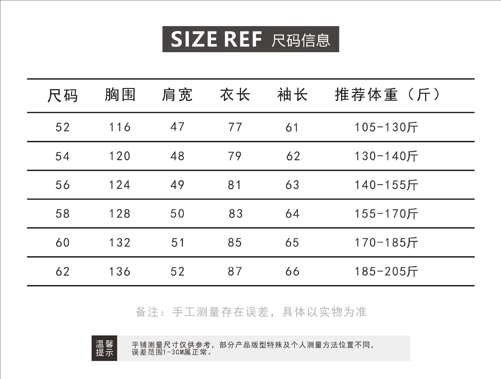 size_info: {"sizeInfoList":[{"length":{"cm":"120","inch":"47.24"},"size":"54 60-70kg","vid":-1},{"length":{"cm":"116","inch":"45.67"},"size":"52 50-60kg","vid":-2},{"length":{"cm":"124","inch":"48.82"},"size":"56 70-77kg","vid":-3},{"length":{"cm":"128","inch":"50.39"},"size":"58 77-85kg","vid":-4},{"length":{"cm":"132","inch":"51.97"},"size":"60 85-90kg","vid":-5},{"length":{"cm":"136","inch":"53.54"},"size":"62 70.3590-97kg","vid":-6}]}