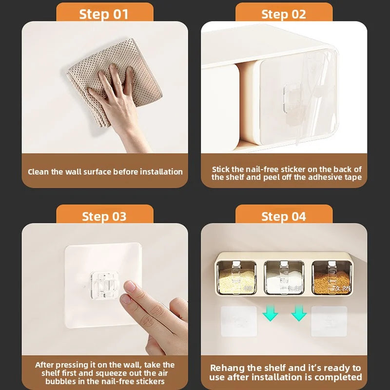 AOBT Wall-mounted moisture-proof seasoning box for home kitchen with condiment bottles for salt, MSG, and other condiments.