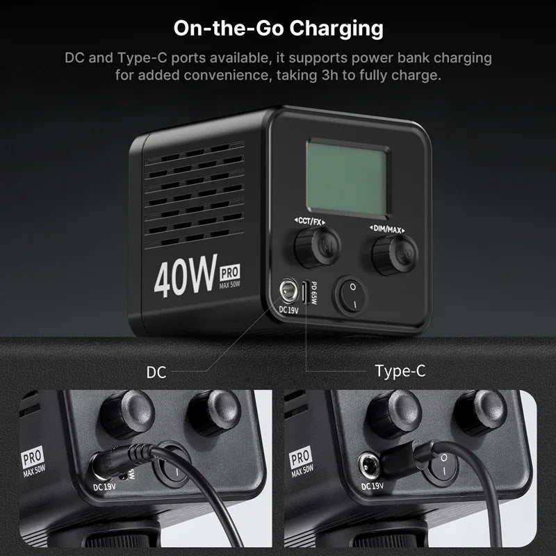 Tips: When charging with the DC port or Type-C port while using, the max power of the light is 40W. Please make sure that your charger and charging cable support charging with PD up to 65W. Charging cable is sold separately.