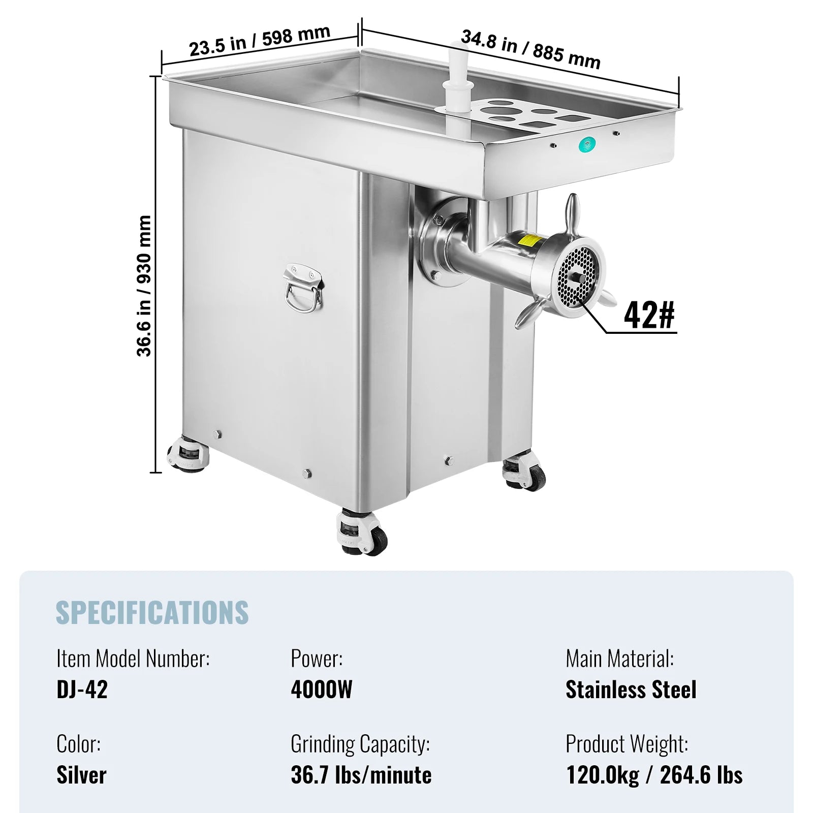 The commercial cabinet-style meat grinder, mouth size 32#, features a highly efficient 2200W pure copper motor capable of grinding 22 lbs of meat per minute. It can operate continuously for over 6 hours, making it ideal for large-scale commercial meat grinding needs.