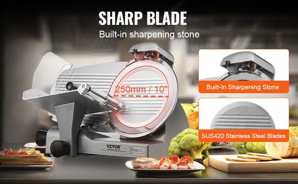 - Upgraded SUS420 Blade: Our meat slicer is equipped with an upgraded 10" wide SUS420 stainless steel blade. Keep the blade sharp with the built-in sharpening stone, effortlessly handling a variety of food textures, such as frozen meat, cheese, raw meat, cooked meat, ham, and bread.