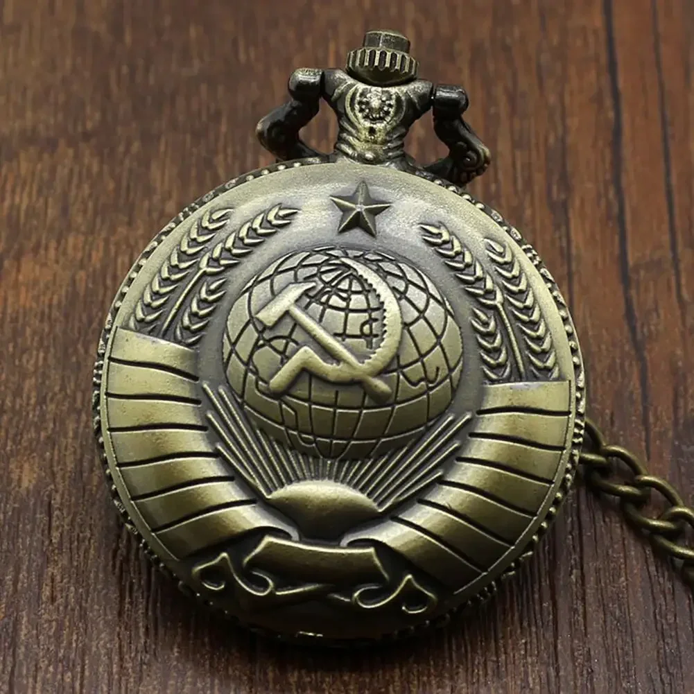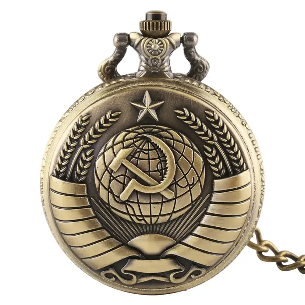Vintage USSR Soviet Badges Sickle Hammer Pocket Watch Necklace Bronze Pendant Chain Clock Fashion Emblem Women Men Gift